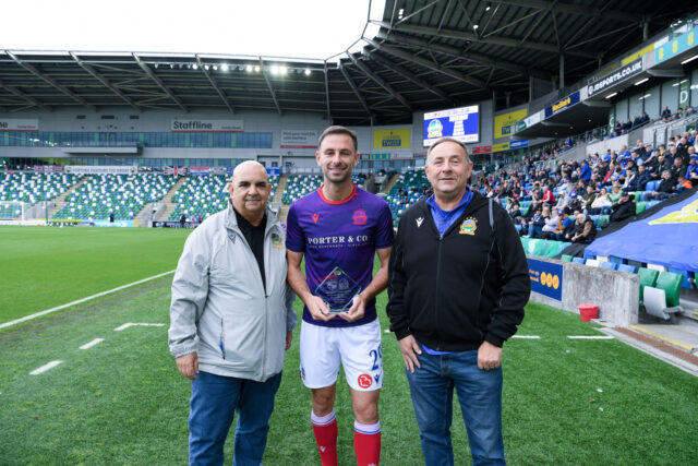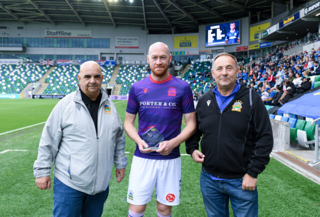 Before the game with Portadown members of 1st Newtownabbey Linfield Supporters Club presented their Player of the Year trophy for 2024/25 to Matthew Fitzpatrick who celebrated with 2 goals!