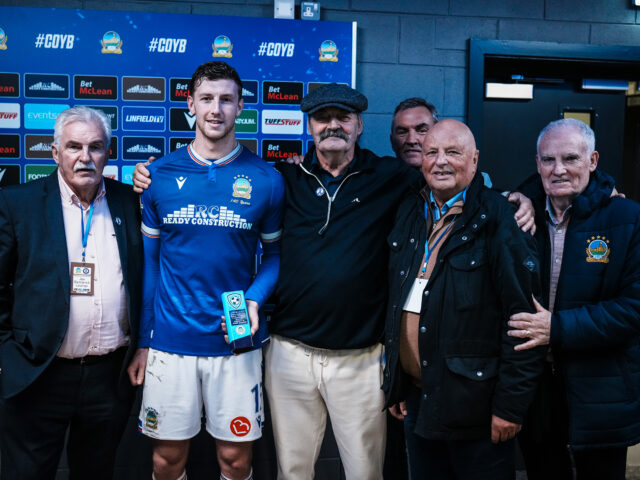 The Linfield Man of the Match sponsored by Ronnie Morrison was presented to Ben Hall by Linfield legends Peter Rafferty, Alan Fraser, George Dunlop and Terry Hayes.