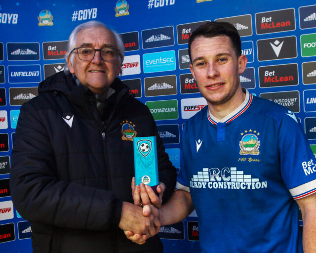 Kyle McClean was presented his Man of the Match trophy by Linfield Trustee Paul Weir.