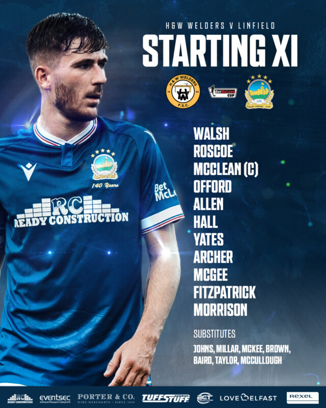 Your Linfield team for tonight’s Bet McLean Cup game against H&W Welders at the Blanchflower Stadium.
