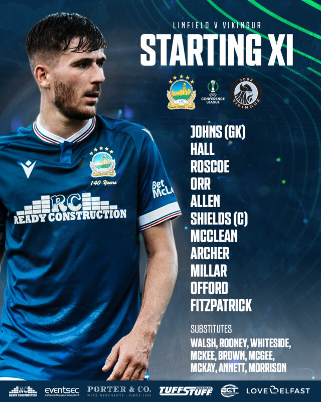 Your Linfield team for tonight’s UEFA Conference League Q3 tie against Vikingur at Windsor Park 🔵