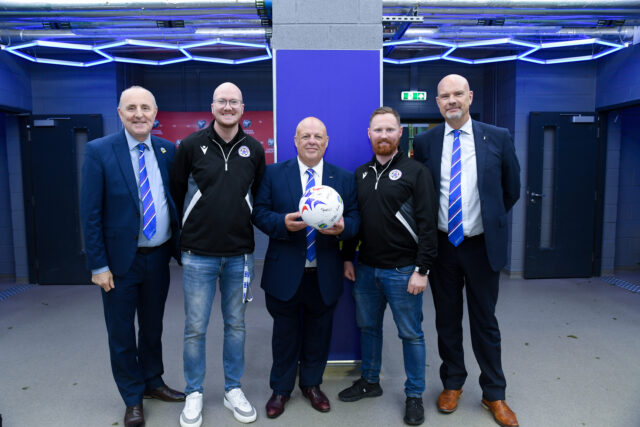Our match ball sponsor for yesterday’s Sports Direct Premiership game with Portadown, ‘Hospice Heroes’, receive their signed match ball from Linfield Vice Chairman Stephen Dickson and Directors Paul White and Jonathan Lamont.