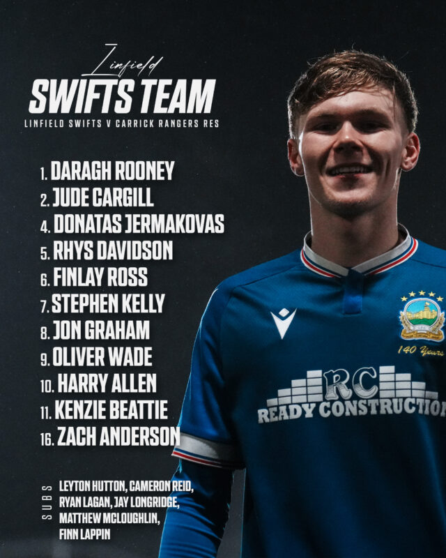 Linfield Swifts team for tonight’s NIFL Premiership Development League match against Carrick Rangers Reserves at Midgley Park.